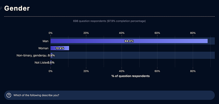 次に性別を見てみましょう。日本におけるエンジニアの男女比は4:1と言われていますが、TokyoDevの調査では回答者の88.4%が男性という結果でした。