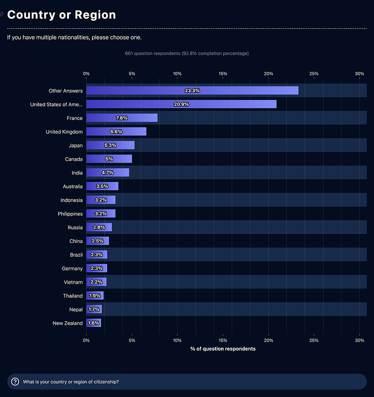 「その他の国」を除いてアメリカが20%で最も高い結果となりました。次に欧州、オーストラリアなどの英語圏が比較的多くなっています。
