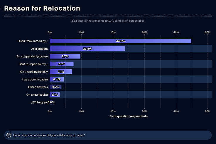 これらの結果から、新卒や第二新卒レベルではなく、一定の職歴を持つ層が多いことが伺えます。これは、ジュニア層では日本企業への転職が簡単ではないことも理由として挙げられるでしょう。