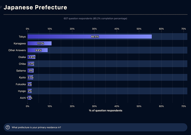 東京が60%と最も多く、関東圏に住んでいる割合は78%と大部分を占めることがわかりました。