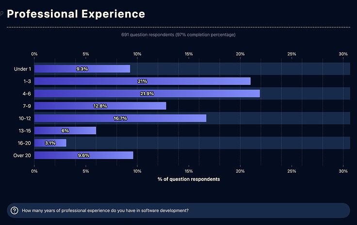 チームに必要なスキルや知識を持っているエンジニアを採用するためには、経験年数を知ること重要です。TokyoDevの調査では、外国籍エンジニアの経験年数中央値は5年でした。