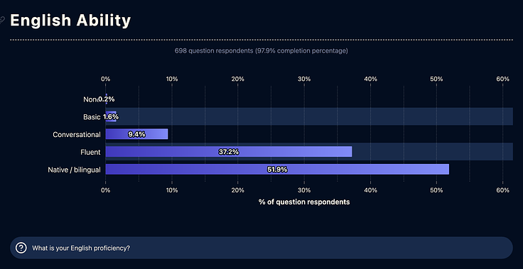 約9割の外国籍エンジニアが流暢もしくはネイティブレベルで英語を話すことができ、英語でのコミュニケーションに問題がないと言えます。