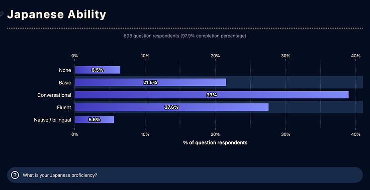 またTokyoDevの調査は、すでに日本で働いているエンジニアを対象にしていますが、回答者の約7割に日常会話以上の日本語能力があることもわかりました。日本に来た当初は日本語が話せないエンジニアでも、日本で生活する中で徐々に日本語を身につける人が多いと推測されます。